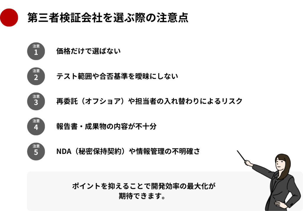 第三者検証を成功させるには、依頼先の能力・体制・適合性を慎重に判断することが不可欠です。
